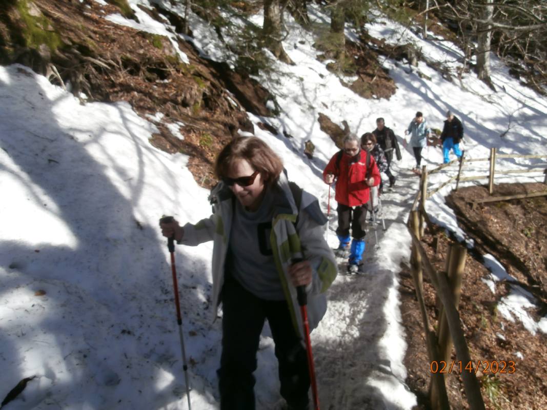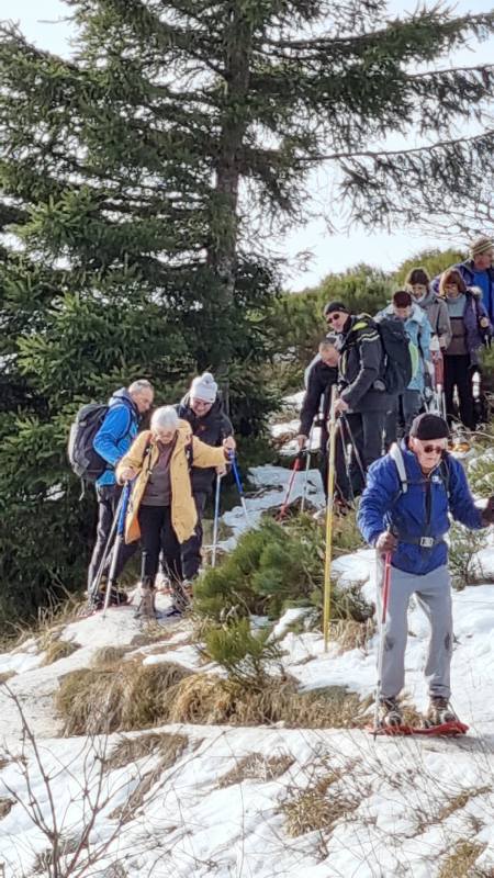 Nous étions environs 27 raquetteuses et raquetteurs le matin et une quinzaine l’après-midi plus nos deux guide préférés Didier et Patrick, sur une neige présente au rendez-vous et avec un beau temps, très ensoleillé et même chaud.