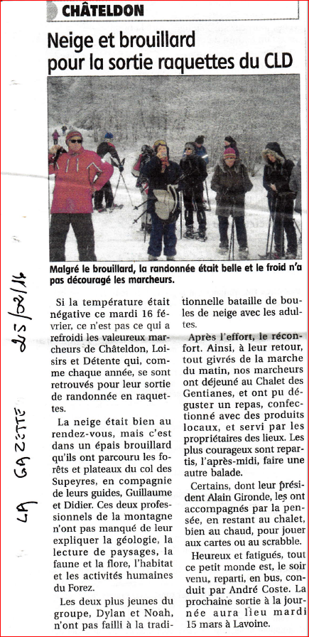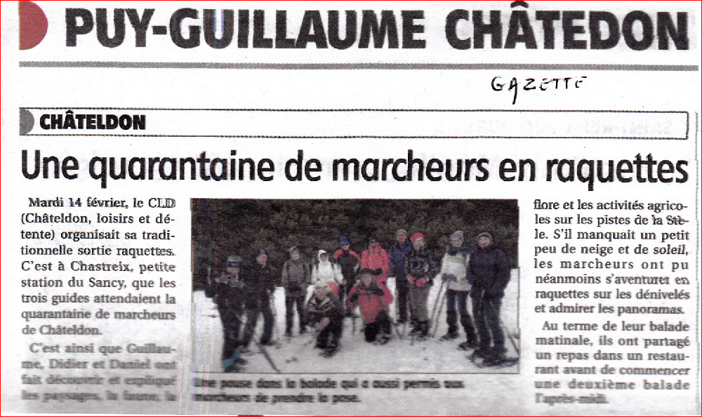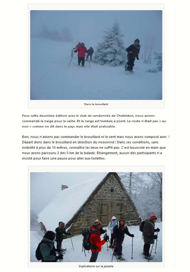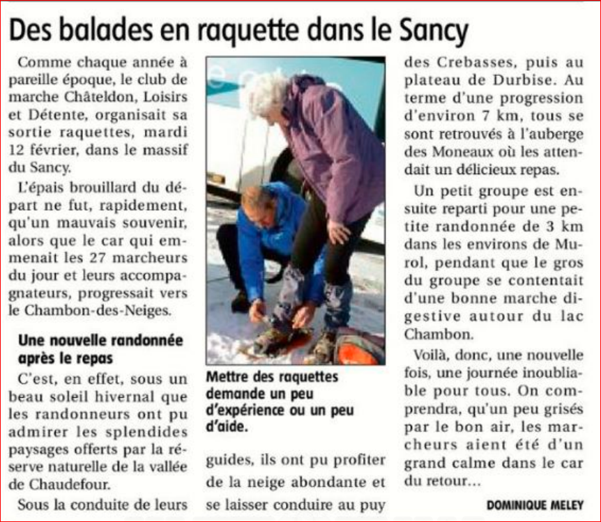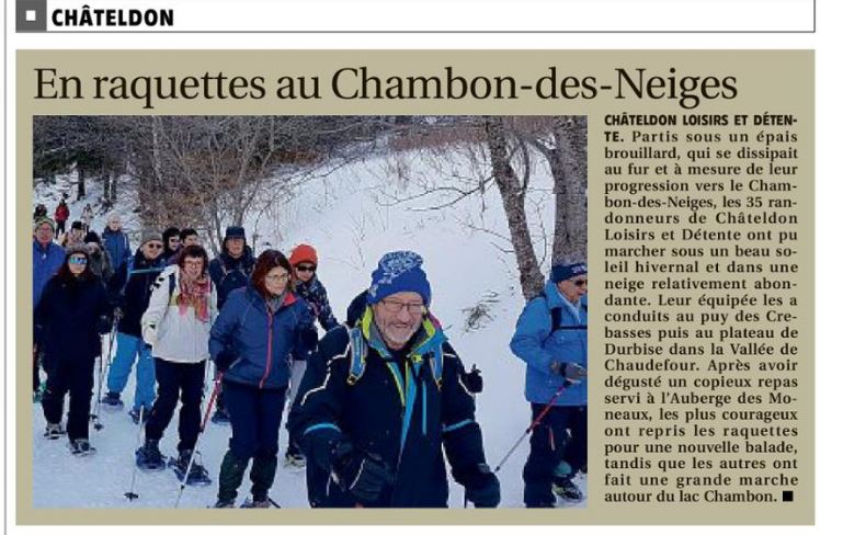 La journée raquettes au Lac du Guery (le matin) et au Mont-Dore (l’A-M), c’est très bien déroulée. Nous étions environs 28 raquetteuses et raquetteurs (malheureusement sans notre Présidente confinée chez elle par la Covid), plus nos deux guide, à affronter une neige relativement abondante mais avec un beau temps, frais et ensoleillé.
