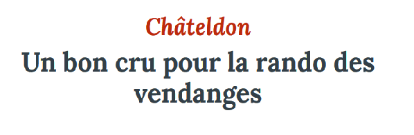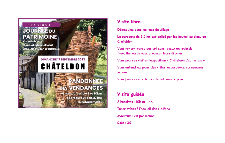 Fait nouveau cette année, la randonnée des vendanges s’est étoffée d’une partie culturelle dans le cadre des Journées du patrimoine en proposant des visites des lieux emblématiques du bourg historique de Châteldon, conduites par Marie Petot ( voir ci-dessous ).