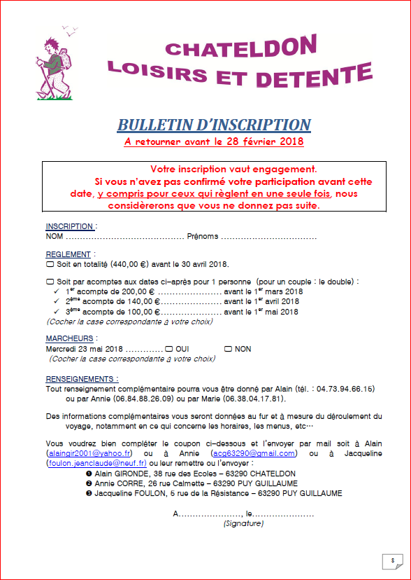Tout renseignement complémentaire pourra vous être donné par Alain (tél. : 04.73.94.66.15) ou par Annie (06.84.88.26.09) ou par Marie (06.38.04.17.81).