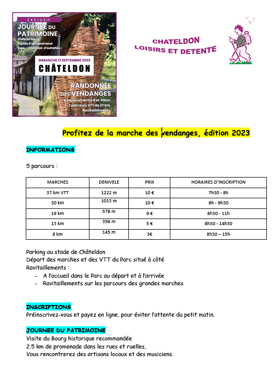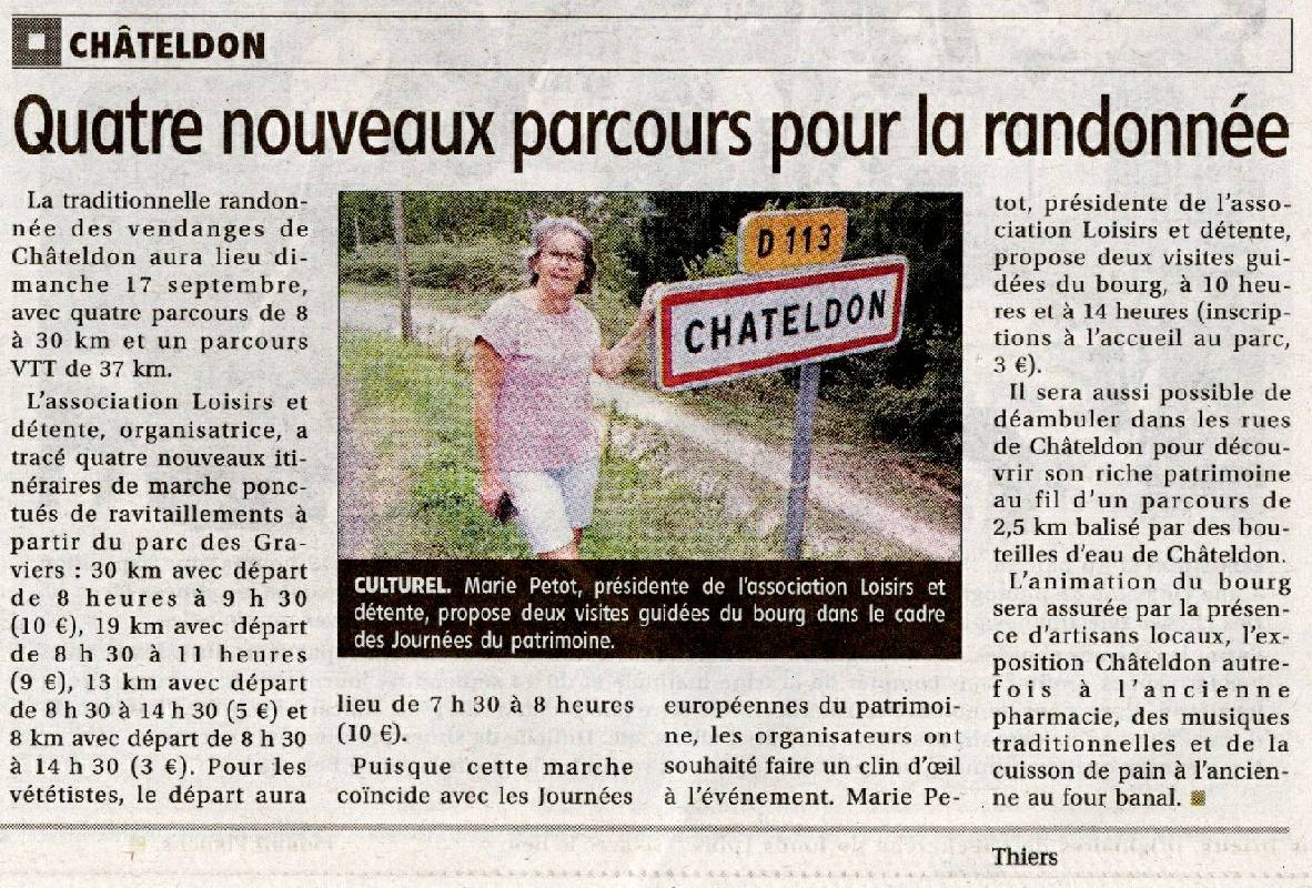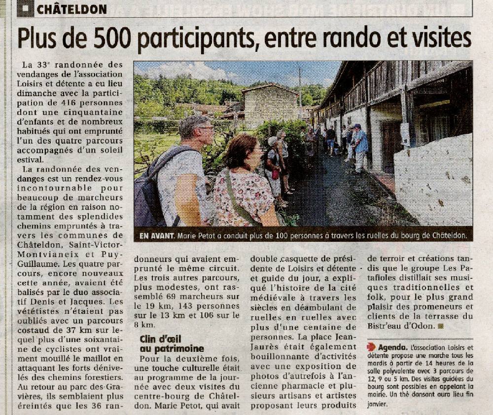 Fait nouveau cette année, la randonnée des vendanges s’est étoffée d’une partie culturelle dans le cadre des Journées du patrimoine en proposant des visites des lieux emblématiques du bourg historique de Châteldon, conduites par Marie Petot ( voir ci-dessous ).